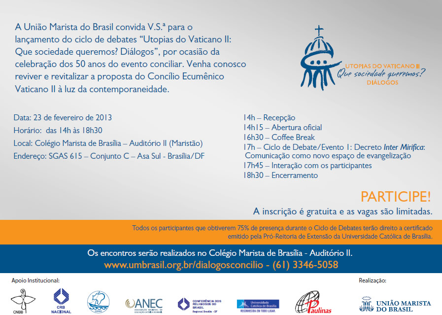 A União Marista do Brasil convida V.S.ª para o lançamento do ciclo de debates “Utopias do Vaticano II: Que sociedade queremos? Diálogos”, por ocasião da celebração dos 50 anos do evento conciliar. Venha conosco reviver e revitalizar a proposta do Concílio Ecumênico Vaticano II à luz da contemporaneidade.