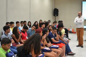 A partir da palestra do conferencista, filósofo e teólogo Leonardo Boff, no 5º Congresso Internacional Marista de Educação, acerca do tema “Educação, Cuidado e Ecologia”, foi realizada, na manhã desta quarta-feira (12/10), a primeira atividade do 2º Congresso Marista de Educandos e Famílias. A Ciranda de Ecosaberes foi mediada pelo Ir. José Wagner Rodrigues da Cruz, vice-presidente das mantenedoras UBEE-UNBEC. Por meio de perguntas e respostas, os estudantes fizeram eco do que ouviram na palestra de Boff, refletindo sobre o cuidado.