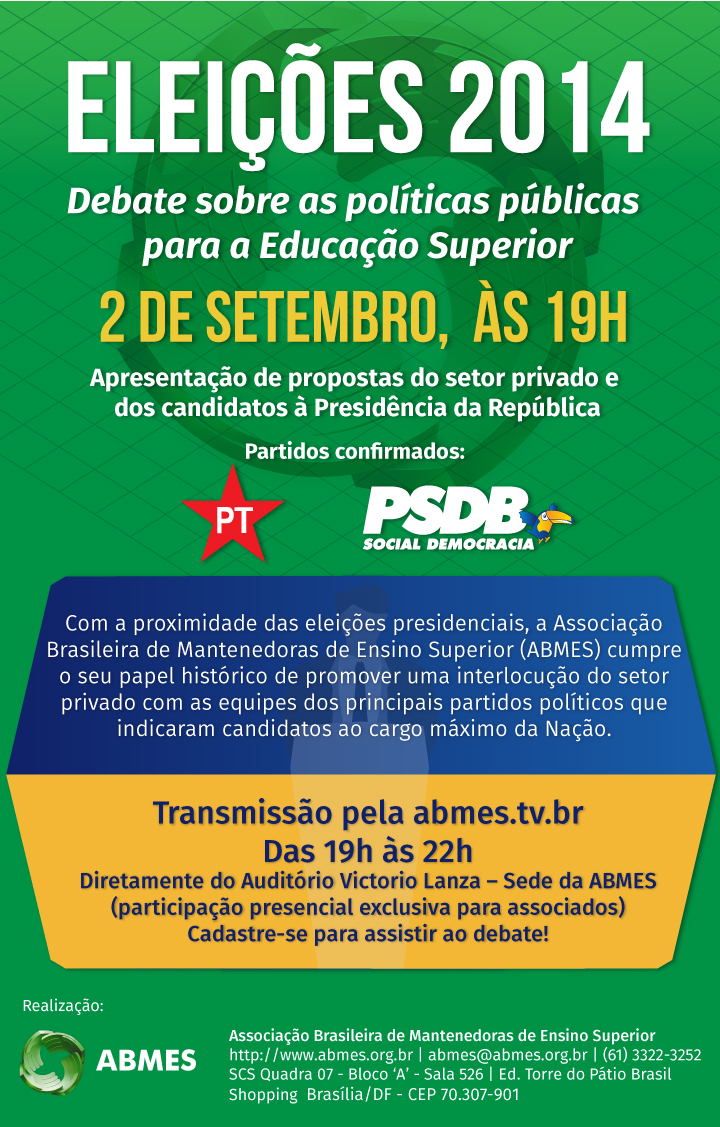 A ABMES (Associação Brasileira de Mantenedoras de Ensino Superior)irá promover no dia 2 de setembro, em sua sede, um debate para apresentação de propostas do setor privado e dos candidatos à Presidência da República. O evento será exclusivo para participação de associados. Demais interessados poderão acompanhar a transmissão ao vivo pela ABMES TV, a partir das 19h.