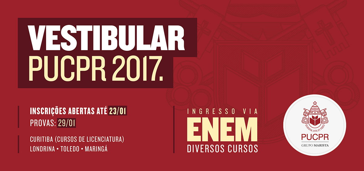 Seguem abertas até o próximo dia 23 as inscrições para o Vestibular de Janeiro 2017 da PUCPR. As provas serão realizadas no dia 29 de janeiro, a partir das 14h. A taxa de inscrição para o vestibular é de R$ 40.