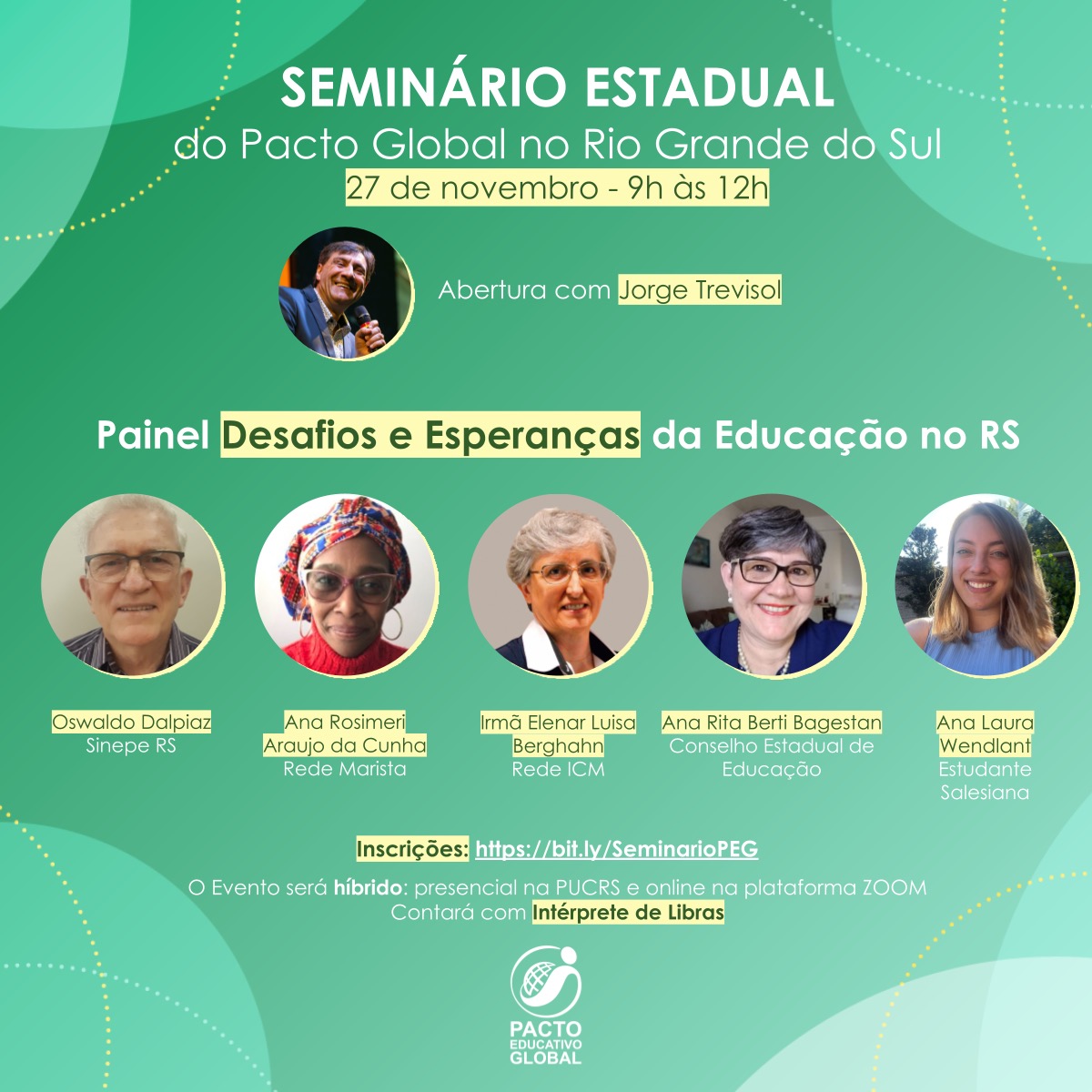 No dia 27 de novembro, das 9h às 12h, será realizado o Seminário Estadual do Pacto Educativo Global. O evento reunirá educadores, gestores e estudantes para sistematizar escutas realizadas nas instituições que compõe o Fórum Estadual do Pacto Educativo Global e propor compromissos comuns na continuidade da mobilização do Pacto no Rio Grande do Sul. O Seminário será realizado em formato híbrido com atividades presenciais no auditório do Prédio 50 da PUCRS e transmissão simultânea pela plataforma Zoom. Interessados devem fazer a inscrição gratuita até o dia 25/11 no link: https://forms.office.com/r/6KwbH4g97S.