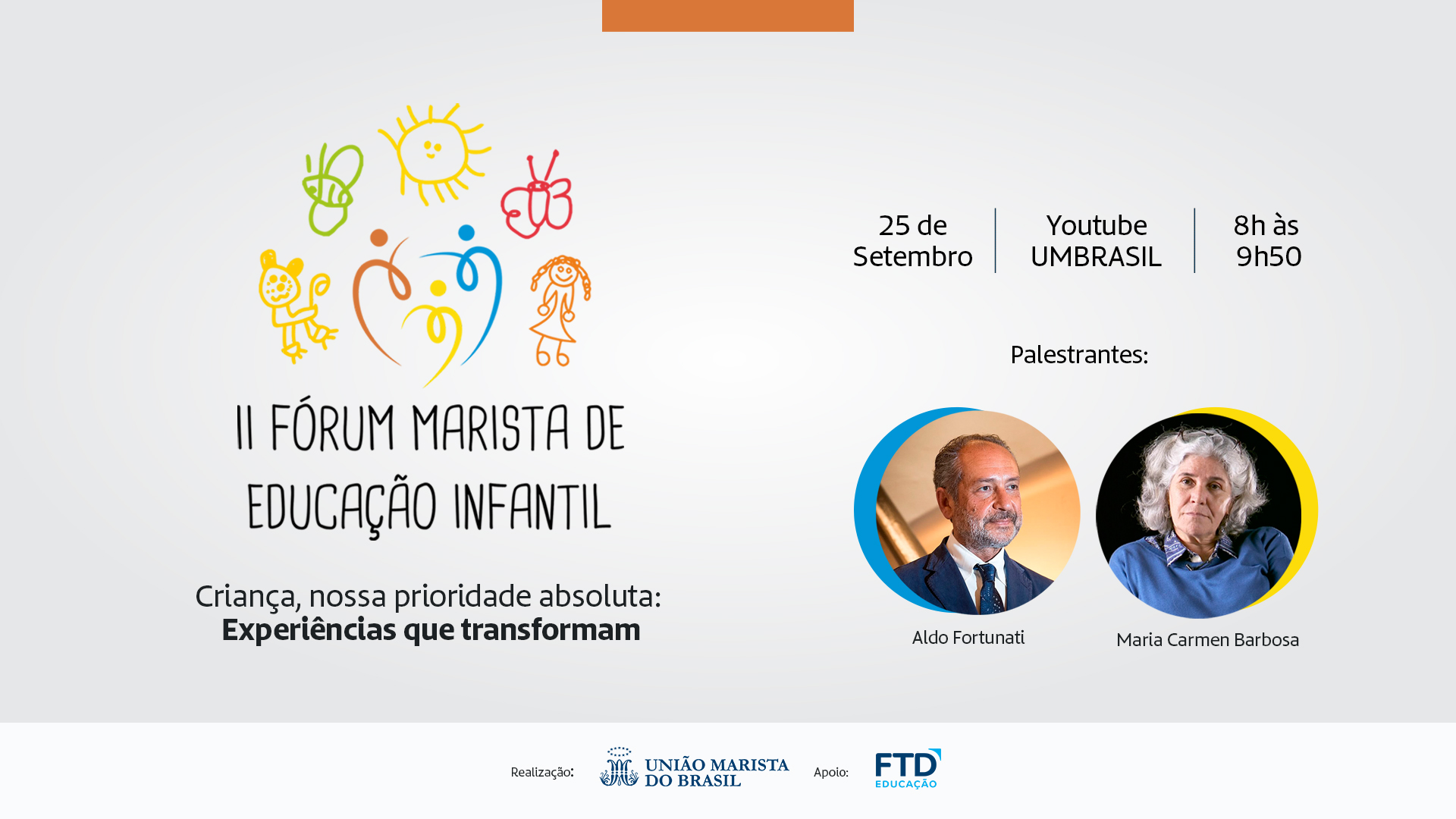 No dia 25 de setembro, das 8h às 9h50, daremos continuidade ao II Fórum Marista de Educação Infantil. O evento será transmitido pelo canal de Youtube da UMBRASIL e é destinado aos gestores, professores, famílias e pastoralistas que atuam na Educação Infantil dos Colégios do Brasil Marista; bem como de outros colégios e Redes de Educação Básica, pública e privada, estudantes e professores de Graduação e Pós-Graduação em Educação.