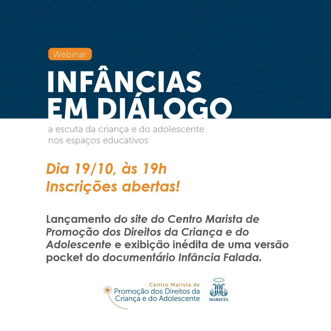 No dia 19 de outubro, o Centro Marista de Promoção dos Direitos da Criança e do Adolescente e o Laboratório de Pesquisas da Comunicação nas Infâncias da PUCRS(LabGim) promovem a webinar Infâncias em diálogo: a escuta da criança e do adolescente nos espaços educativos. O evento será transmitido pelo Zoom, a partir das 19h. As vagas são limitadas e as inscrições estão abertas até o dia 18.